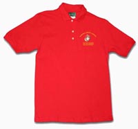 Polo Shirt: A scarlet-colored men's polo shirt with the Marine Corps emblem centered between